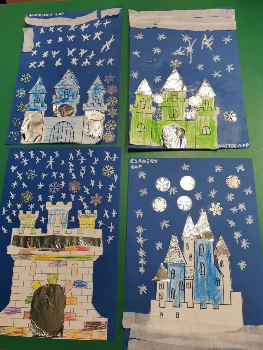 W lekturniku uczniowie uzupełnili strony związane z lekturą. Wykonali kolaż: pałac królowej śniegu oraz lodowe witraże. Witraże zostały zawieszone na gałęziach drzew. Na koniec wszyscy uczestnicy projektu połączyli się nicią przyjaźni.