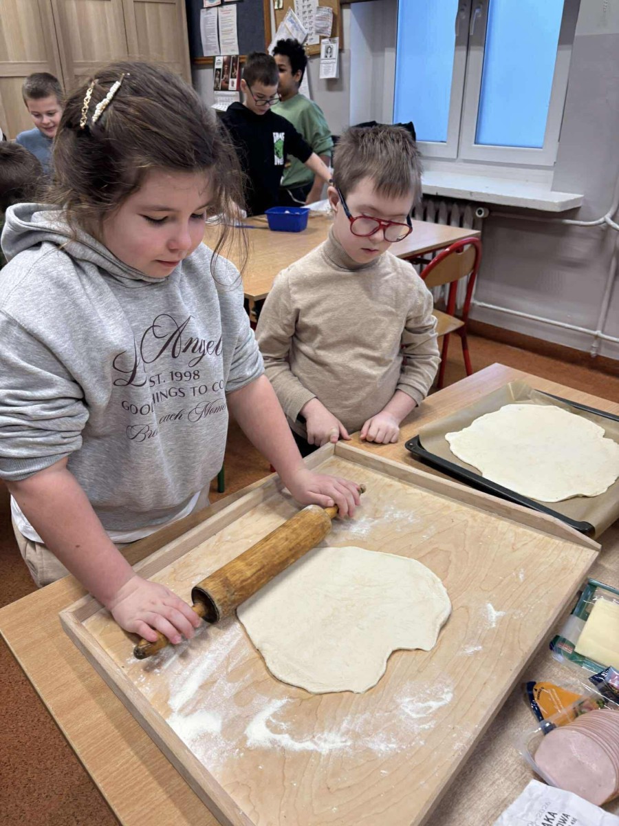 W dniu 09.02.2026 r. z okazji Dnia Pizzy uczniowie klas 1–3 wzięli udział w zajęciach kulinarnych, podczas których poznali zasady higieny oraz samodzielnie przygotowali pizzę z wybranymi składnikami. Zajęcia były okazją do wspólnej zabawy, nauki i integracji.