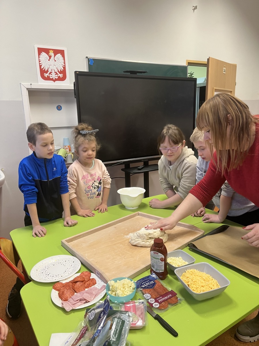 W dniu 09.02.2026 r. z okazji Dnia Pizzy uczniowie klas 1–3 wzięli udział w zajęciach kulinarnych, podczas których poznali zasady higieny oraz samodzielnie przygotowali pizzę z wybranymi składnikami. Zajęcia były okazją do wspólnej zabawy, nauki i integracji.