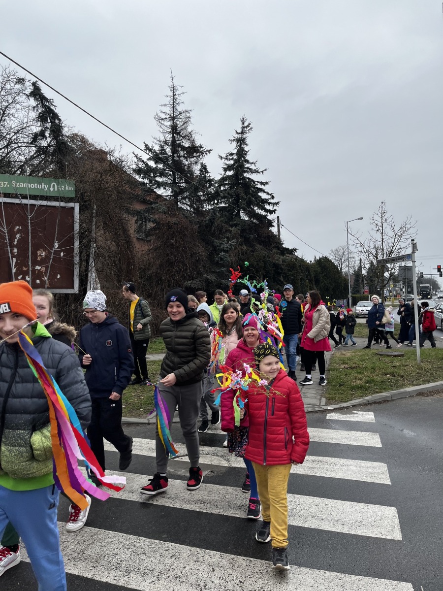 Uczniowie ubrali się kolorowo, a wcześniej przygotowane gaiki towarzyszyły nam podczas radosnego pochodu ulicami Szamotuł. Było głośno, wesoło i bardzo wiosennie!
