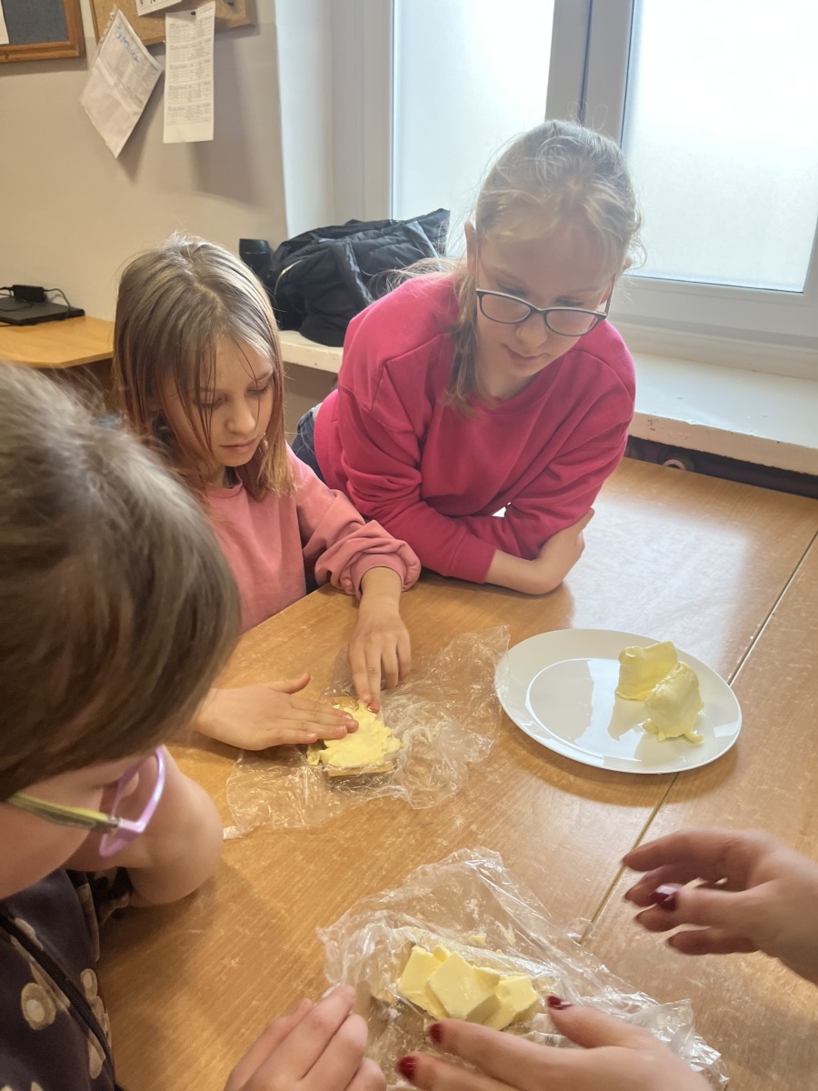 Uczniowie z zaangażowaniem przygotowywali świąteczne smakołyki – sałatkę jarzynową, babeczki oraz urocze baranki z masła 🐑