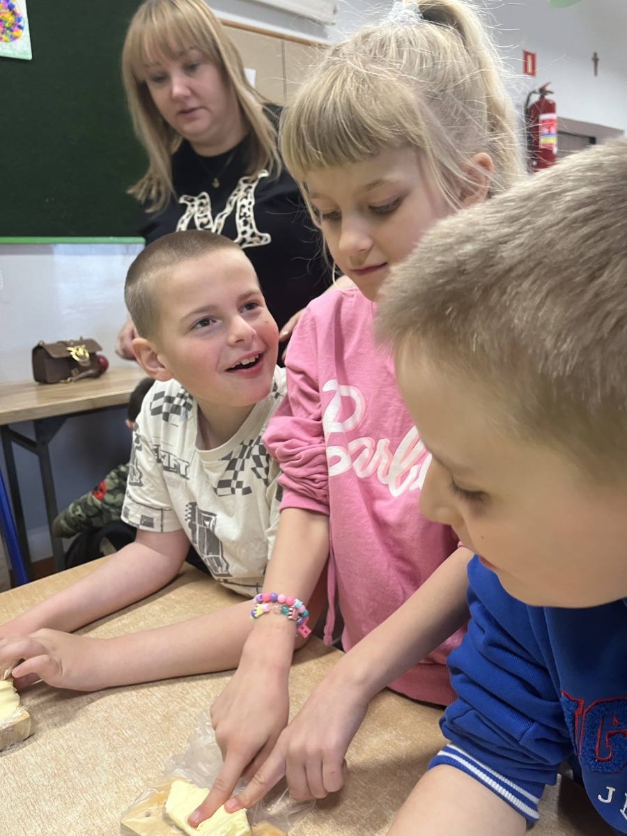 Uczniowie z zaangażowaniem przygotowywali świąteczne smakołyki – sałatkę jarzynową, babeczki oraz urocze baranki z masła 🐑