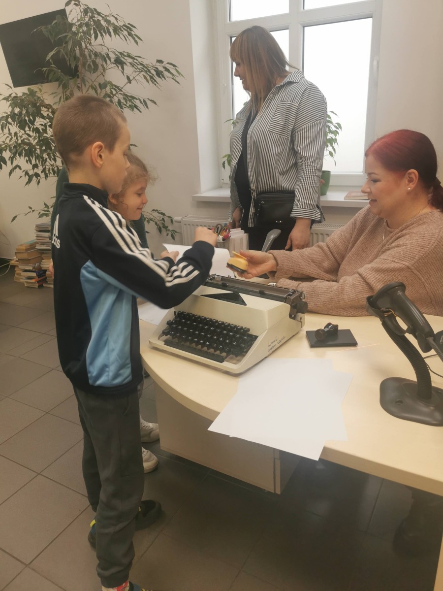 I choć nie ma tam książek dla dzieci, ale jest wiele innych interesujących rzeczy. Najbardziej fascynujące okazały się zabytkowe maszyny do pisania, ale także teatrzyk kamishibai. Uczniowie byli tak zainteresowani, że zajrzeli nawet do biura szefowej ZNP. Dziękujemy pani Elwirze i panu kierownikowi Bartkowi. A Pani Sylwii, szefowej ZNP za czekoladki.