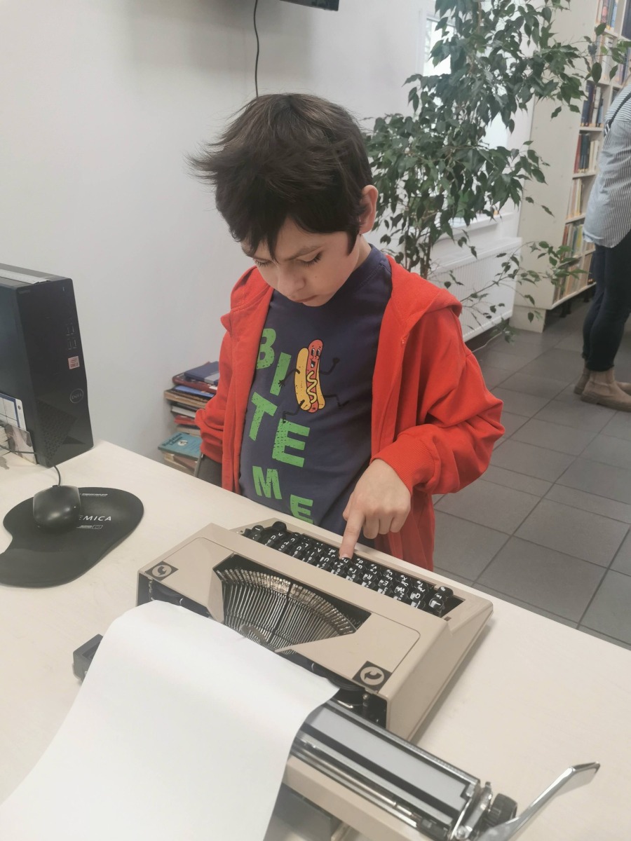 I choć nie ma tam książek dla dzieci, ale jest wiele innych interesujących rzeczy. Najbardziej fascynujące okazały się zabytkowe maszyny do pisania, ale także teatrzyk kamishibai. Uczniowie byli tak zainteresowani, że zajrzeli nawet do biura szefowej ZNP. Dziękujemy pani Elwirze i panu kierownikowi Bartkowi. A Pani Sylwii, szefowej ZNP za czekoladki.