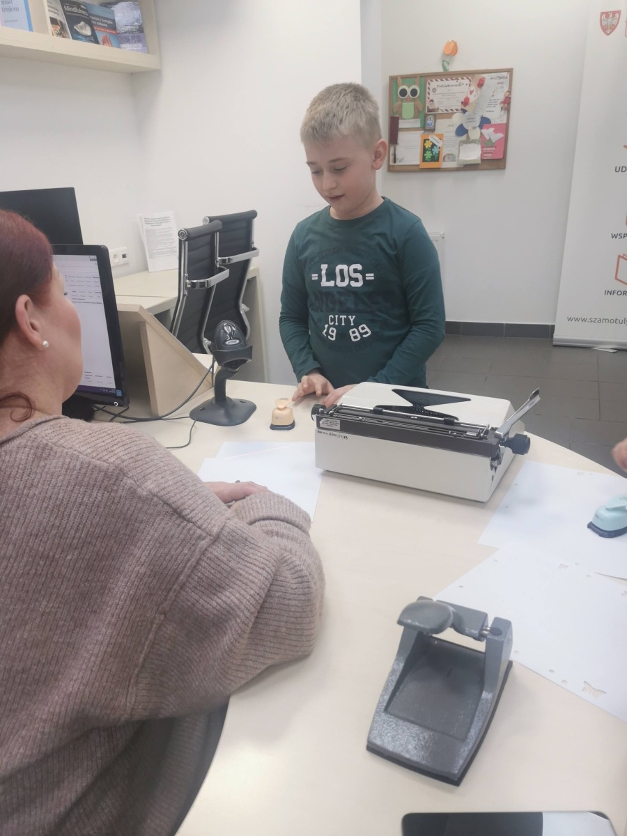I choć nie ma tam książek dla dzieci, ale jest wiele innych interesujących rzeczy. Najbardziej fascynujące okazały się zabytkowe maszyny do pisania, ale także teatrzyk kamishibai. Uczniowie byli tak zainteresowani, że zajrzeli nawet do biura szefowej ZNP. Dziękujemy pani Elwirze i panu kierownikowi Bartkowi. A Pani Sylwii, szefowej ZNP za czekoladki.